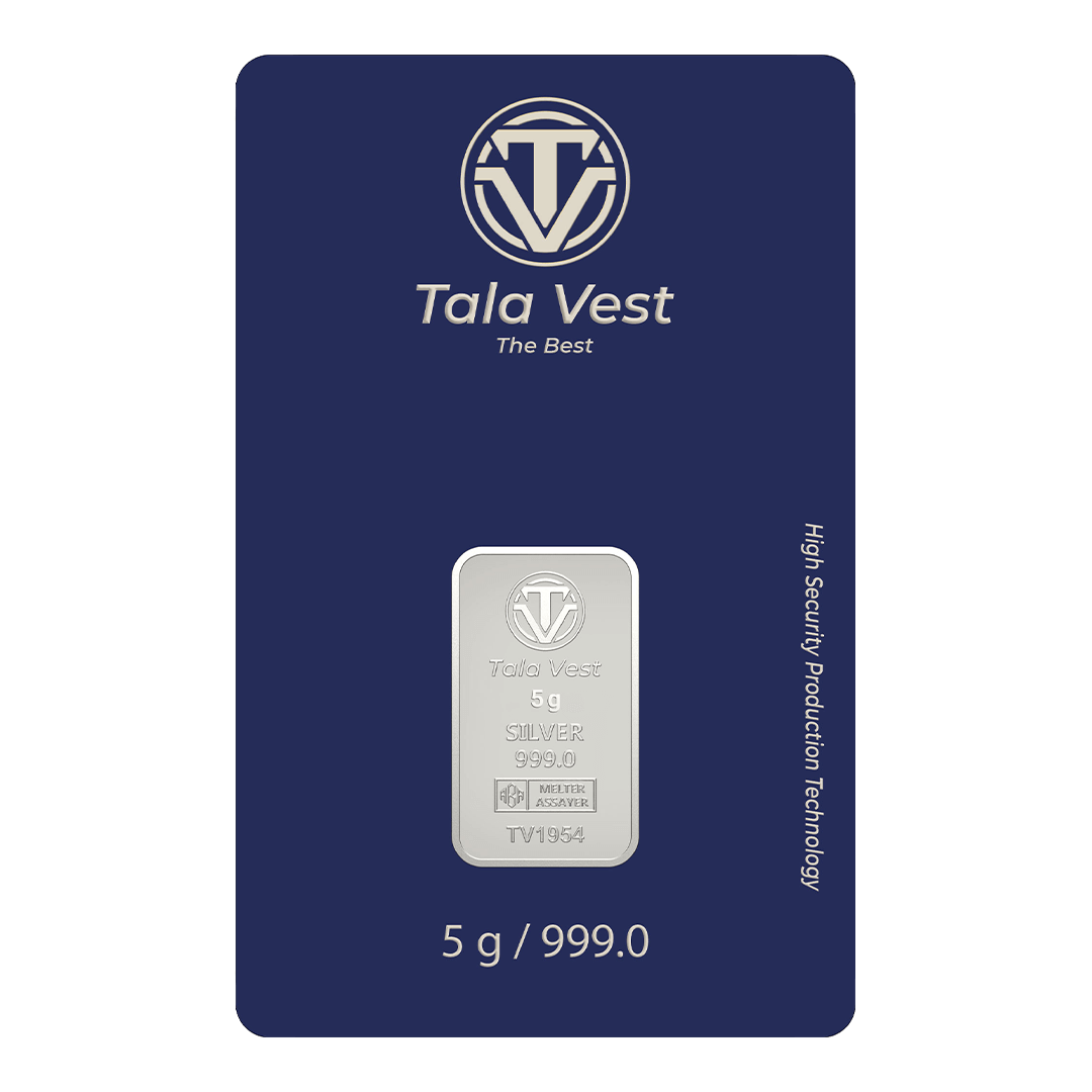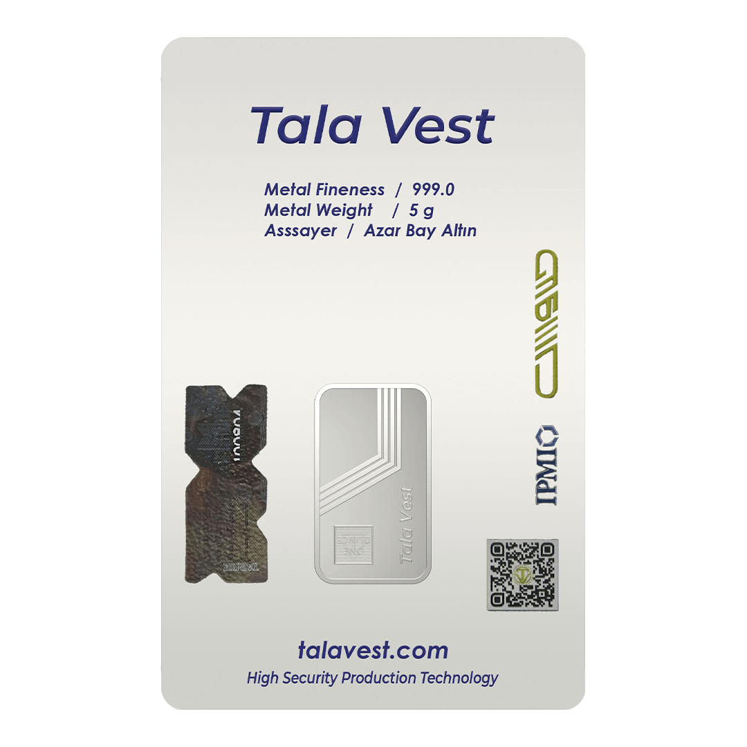 شمش نقره ۵ گرمی TalaVest با نقره خالص ۹۹۹، انتخابی مطمئن برای سرمایه‌گذاری، با فاکتور رسمی و طراحی زیبا.