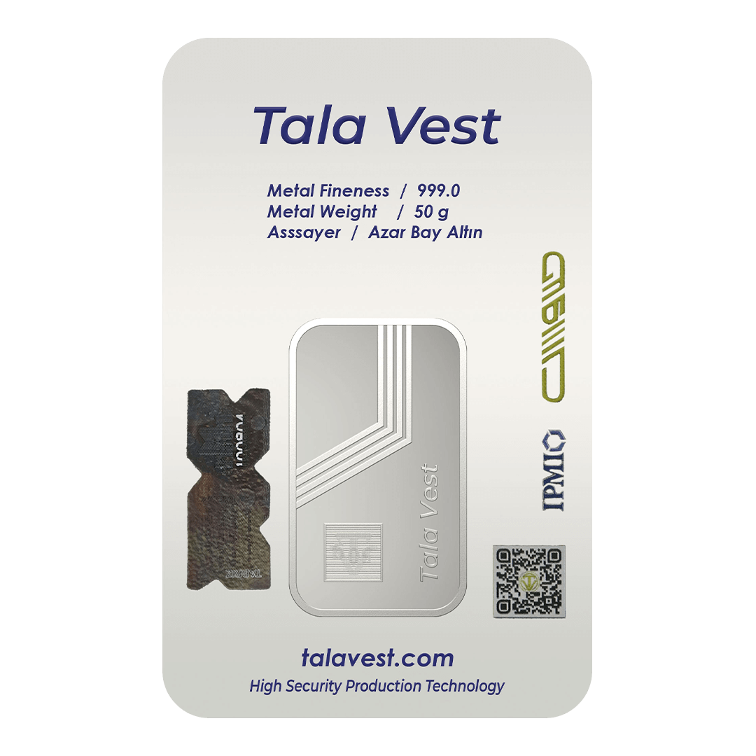 شمش نقره ۵۰ گرمی Tala Vest با نقره خالص ۹۹۹، انتخابی مطمئن برای سرمایه‌گذاری، با فاکتور رسمی و طراحی زیبا.