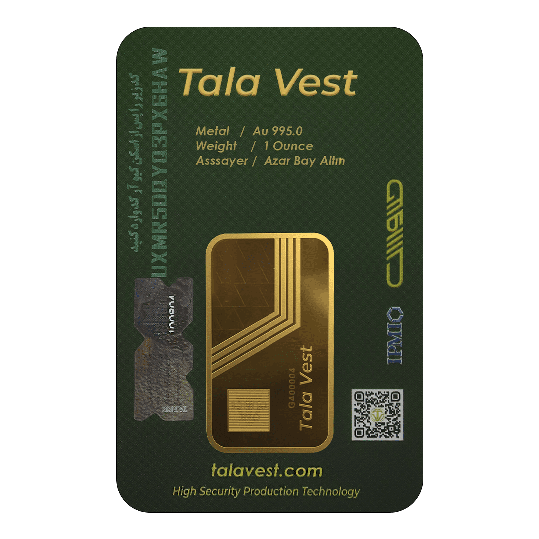 شمش طلای 1 اونسی TalaVest نماد سرمایهگذاری هوشمندانه و حفظ ارزش پول در بلندمدت است. این شمش با طلای ۲۴ عیار و خلوص 995 تولید شده که نشان از نهایت کیفیت و خلوص دارد. طراحی مینیمال، حک برند TalaVest و بستهبندی پلمپشده، این محصول را به گزینهای بینقص برای سرمایهگذاران و مجموعهداران تبدیل کرده است.